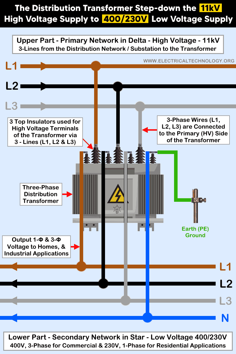 The main purpose of a distribution transformer is to step-down the high level of distributed voltage to low level of voltage according to the needs of consumers (both commercial and residential). The common voltage from the transformer secondary to the panels are 400V three phase and 230V single phase in the UK and IEC following countries while 120V, 240V single phase and 277, 480V three phase in the US.
