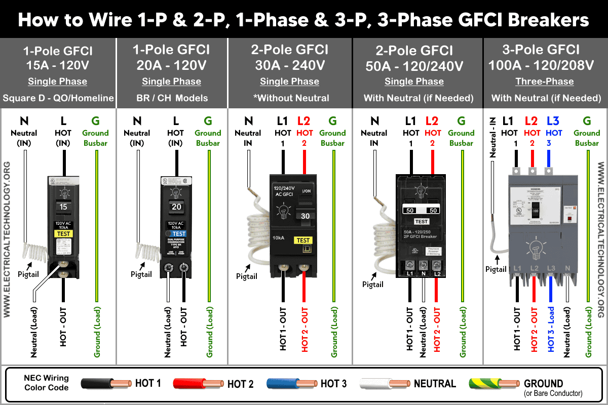 How to Wire 1-Pole & 2-Pole , 1-Phase GFCI and 3-Pole, 3-Phase GFCI Breakers