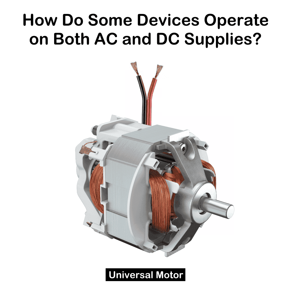 - Universal Motors: Certain motors, known as universal motors, are designed to run on both AC and DC due to their unique construction and special components like commutator and carbon brushes.