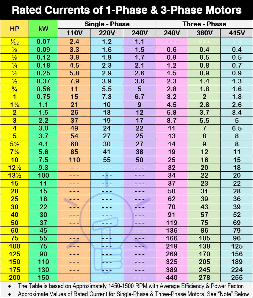 | Rated Currents of 1-Phase & 3-Phase Motors | |||||||
