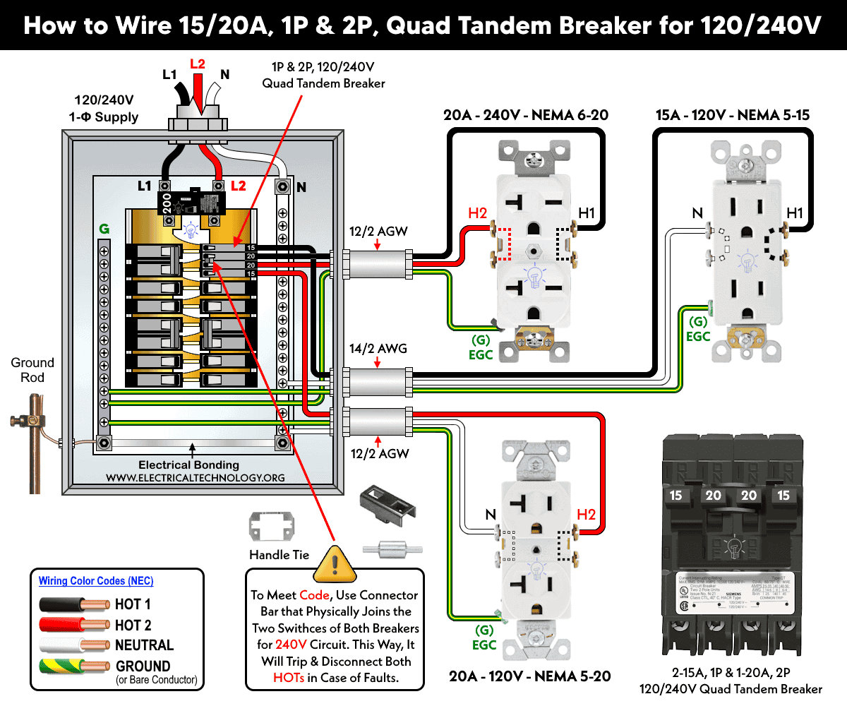 In the wiring diagram below, we have used a quad tandem breaker consisting of two 15A single-pole breakers and one 20A two-pole (120/240V) breaker to supply both 120V and 240V outlets. As shown, the 20A inside terminals are used to feed a 20A, 240V (NEMA 6-20) receptacle. A handle tie is installed between the switches of the inside terminals to provide a common trip mechanism in case of a fault.
