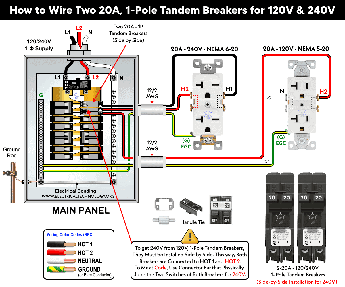 In the following diagram, two 20A, 240V single-pole tandem breakers are installed side by side. The inside terminals are used to supply a 20A, 240V outlet (NEMA 6-20), while the lower 20A terminal is used for a 20A, 120V outlet (NEMA 5-20).