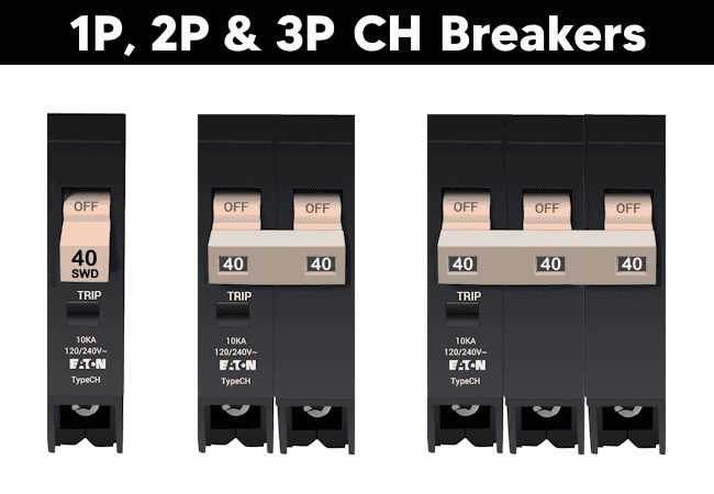 CH breakers are ¾-inch per pole, 120/240V rated, and are designed exclusively for CH load centers. A defining feature of CH breakers is their tan-colored handle, which makes them easy to identify in the field.