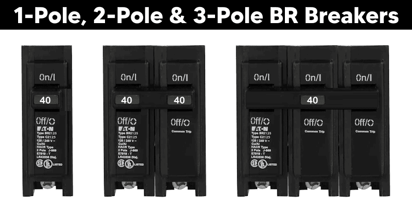 BR breakers are 1-inch per pole, 120/240V rated, and fit only BR-type load centers. They are easily identified by their black handle, similar in appearance to many other residential breaker brands.