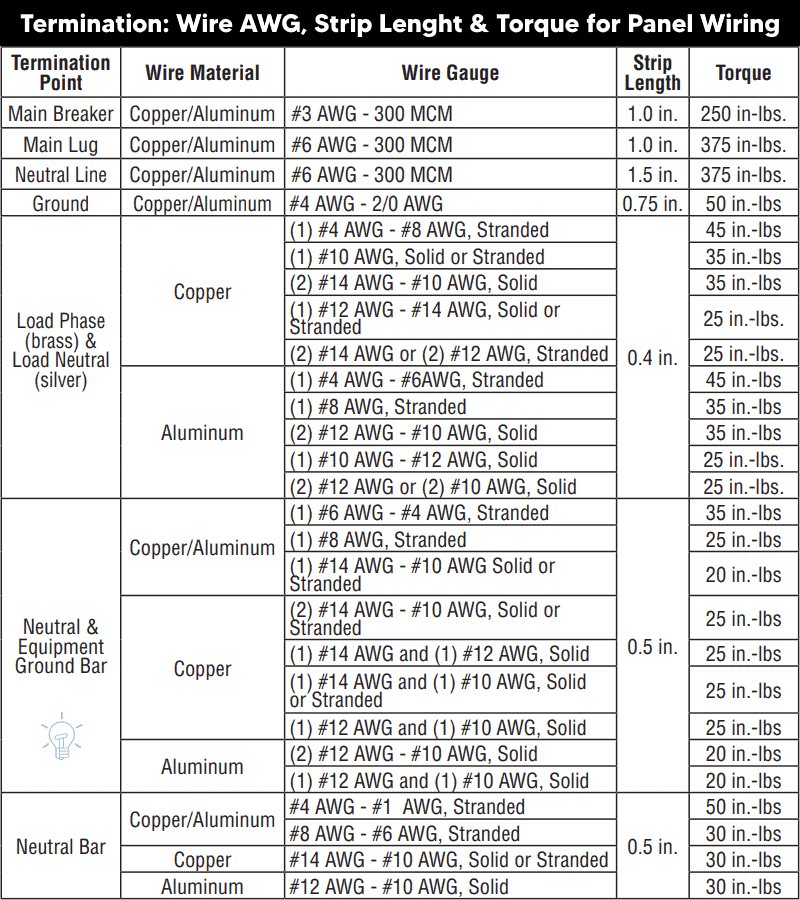 Termination: Wire, AWG, Stripe Length & Torque for Load Center Wiring