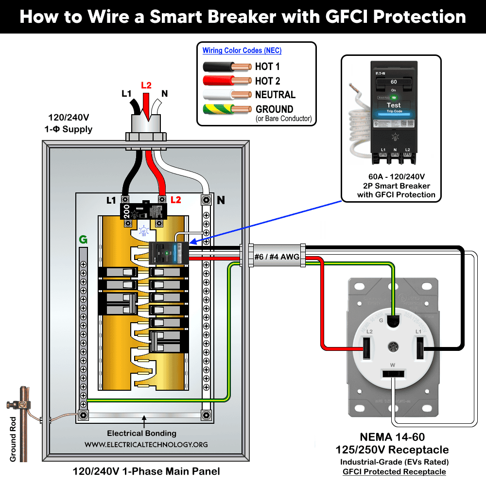 As shown in the wiring diagram, a 2-pole, 120/240V smart breaker with GFCI protection (SBR260WGF – AbleEdge BR smart breaker) is used for a 60A, 125/250V receptacle (NEMA 14-60) in a standard 120V/240V panel.