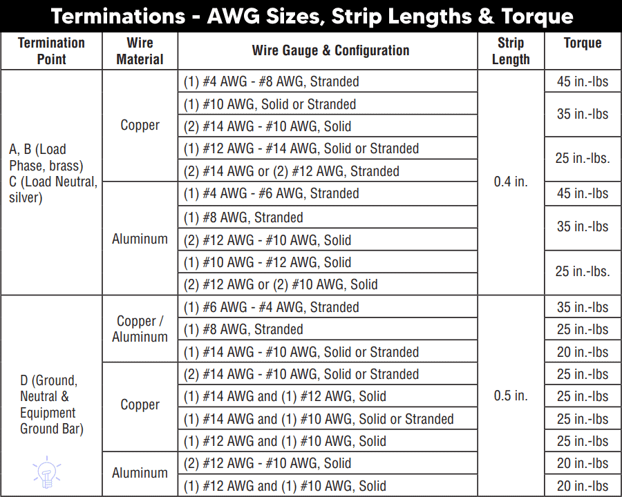 The following chart provides wire sizes (AWG), strip lengths, and torque values for proper termination of smart breakers used in Leviton smart electrical panels. If your panel or breaker is from a different brand, refer to the manufacturer’s user manual or consult a licensed electrician.