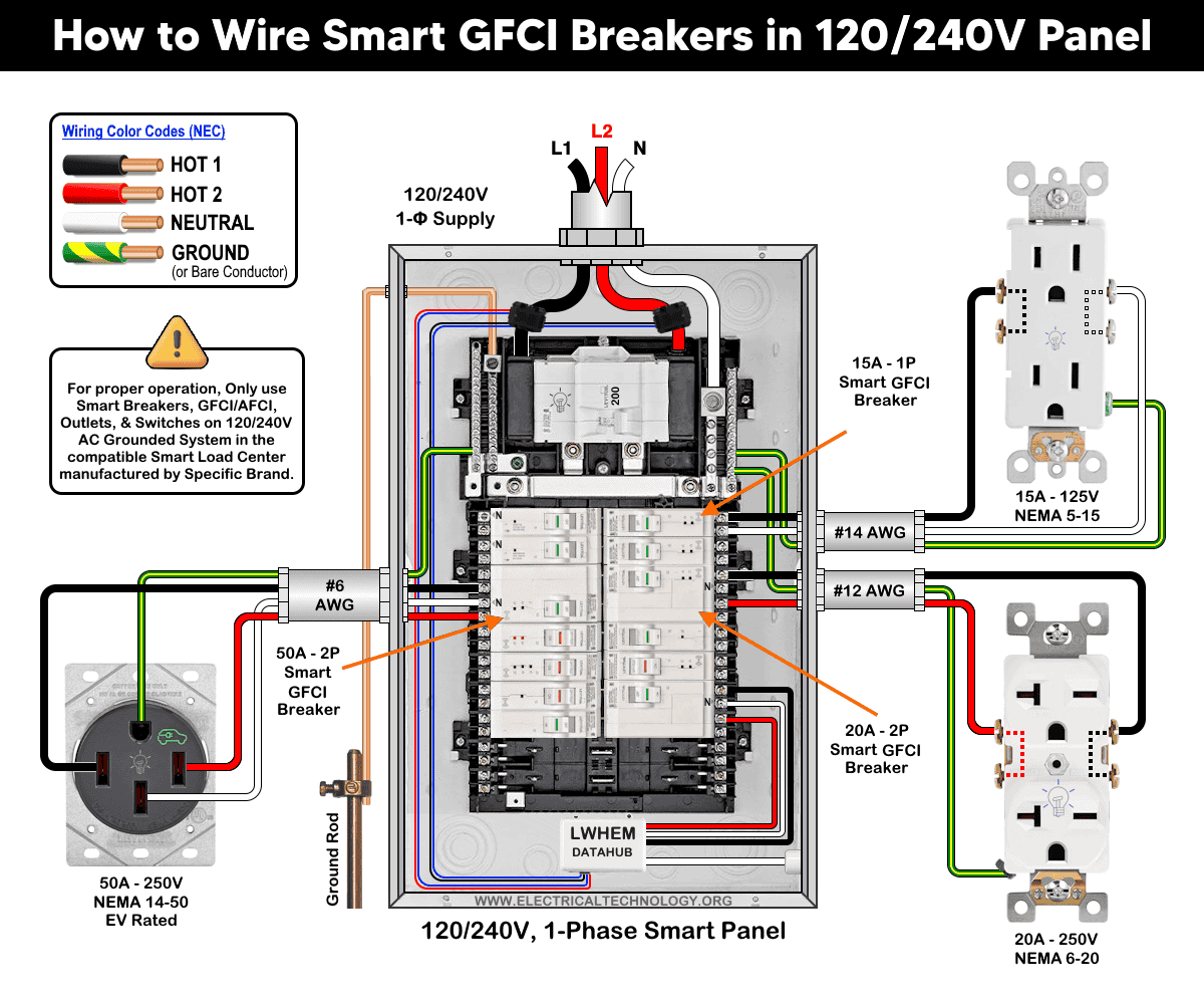 The following wiring diagram shows a 1-pole 15A/120V (LB115-GS) and 20A – 240V (LB220-GST) and 50A, 2-pole 120/240V (LB250-GST) smart GFCI breakers in a smart 120V/240V load center by Leviton (LP220-BPD).
